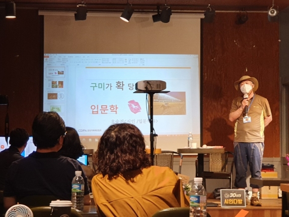 산업도시이자 인문학의 고장, 구미의 위상을 널리 알리고자 문학을 사랑하는 독자들과 함께 하는 ‘수요문학회’와 ‘30년전 시인다방’이 주관하는 가을맞이 문학행사로 마련된 것. 김연화, 김대호, 권미강 등 첫 시집을 낸 세 사람의 수요문학회 소속 시인의 출판기념 행사 및 북토크와 시낭송 행사는 패널토론, 시 낭송회, 입문학 특강, 춤 치유 등 다채로운 문학콘서트로 진행됐다.
