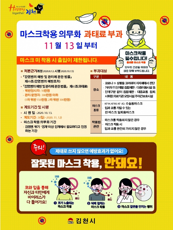 김천시가 감염병예방 및 관리에 관한 법률이 개정됨에 따라 코로나19 예방 및 확산 차단을 위해 감염병 전파의 위험성이 있는 장소 또는 시설의 관리자·운영자·이용자 등에 대해 ‘마스크 착용 의무화’ 행정명령을 발령했다.