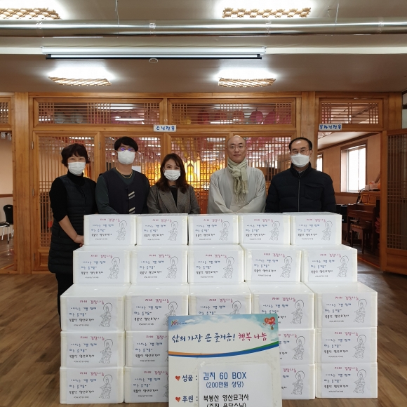 북봉산 영산 묘각사(주지 용담스님, 구미시 봉곡동 위치)가 7일 지역의 어려운 이웃을 위해 선주원남동(동장 남재식)에 김장김치 60통(200만원 상당)을 전달했다.