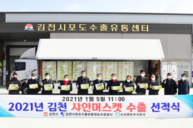 김천시가 지난 5일 김천시포도수출유통영농조합법인에서 샤인머스켓 3.3톤을 베트남으로 수출하는 선적식을 가졌다고 밝혔다.