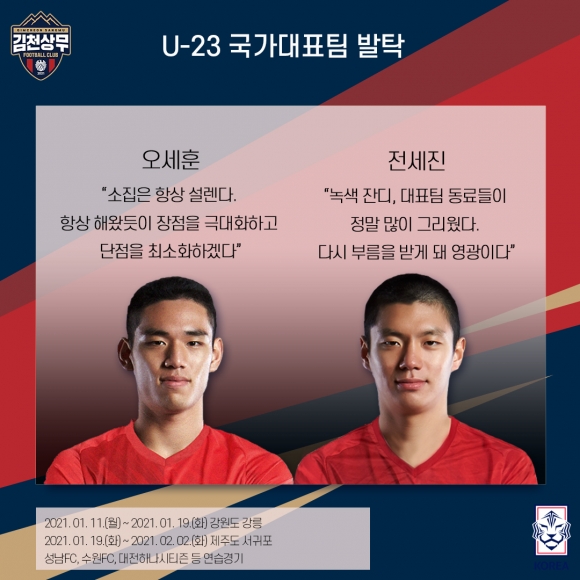 대한축구협회가 지난 5일 2021년 첫 소집 훈련에 참가할 U-23 대표팀 전지훈련 명단을 발표했다. 김천상무프로축구단(대표이사 배낙호) 오세훈, 전세진이 U-23 명단에 포함됐다. 김학범 감독이 이끄는 U-23 대표팀은 오는 11일부터 19일까지 강릉에서 1차 훈련을, 19일부터 내달 2일까지 서귀포에서 2차 훈련을 진행한다.