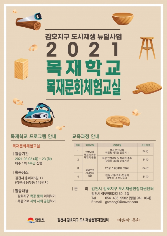 김천시(시장 김충섭)가 감호지구 도시재생 뉴딜사업 추진의 일환으로 창업 및 목재 문화 저변 확대를 위해 감호지구 목재학교를 운영한다.