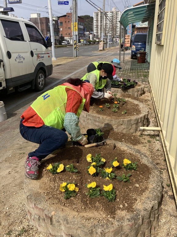↑↑ 19일 구미시 지산동(동장 이운균)이 공공근로 참여자, 공무원 등이 참여한 가운데 지역내에 양심화분 및 선산대로 일대에 봄꽃 800여 본을 식재했다.