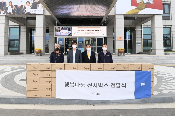 ㈜미래(대표 김근하, 노은석)가 4월2일 김천시청을 방문해 지역 저소득층 후원을 위한 천사박스 100개(250만원 상당)를 전달했다.
