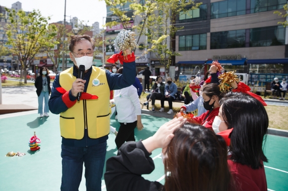 장세용 구미시장이 지난 17일 구평동 별빛공원 현장을 찾아 '꾸러기 놀이학교' 1일 놀이활동가로 나서서 아이들과 동심으로 돌아가 사방치기, 제기차기, 굴렁쇠 등 요즘 접하기 힘든 전래놀이를 함께 했다.