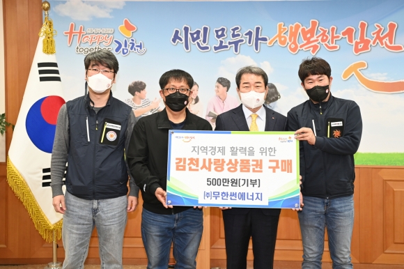 지난 2월 500만원 구입에 이어, 2번째 구매 운동에 동참한 ㈜무한썬에너지는 이번에 구입한 상품권 500만원을 어려운 이웃을 돕기 위해 김천시에 전달했다.