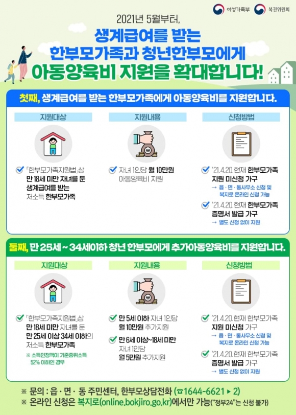종전에는 저소득 조손가족 또는 만 25세 이상 미혼 한부모가족의 만 5세 이하 아동에게 추가아동양육비 월 5만원을 지원했으나, 5월부터는 만 25세~34세 이하 청년한부모가족도 자녀 나이에 따라 추가아동양육비를 차등 지원받는다.