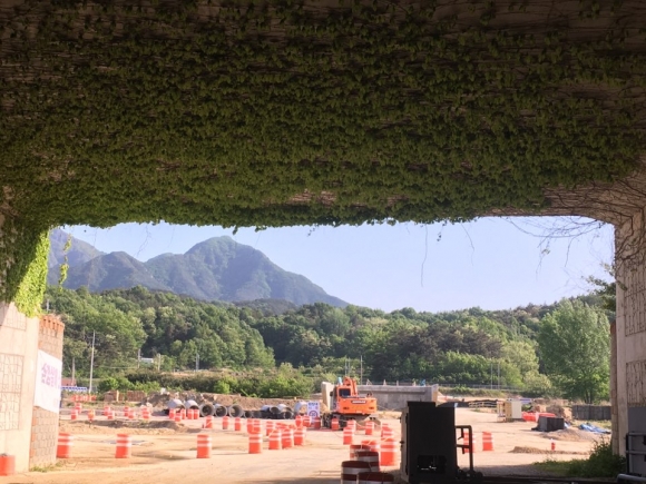 담쟁이덩굴 콘크리트(구미시 선기동 진줄교) 액자 속에는 금오산 서쪽 기슭 아래 북구미 하이패스IC 공사 현장이 담겨져 있다. 칙칙한 회색 옹벽 위의 담쟁이덩굴은 공사장까지 한 폭의 그림으로 만들어 줄 뿐만 아니라 봄을 더욱 싱그럽게 해주고 있다.