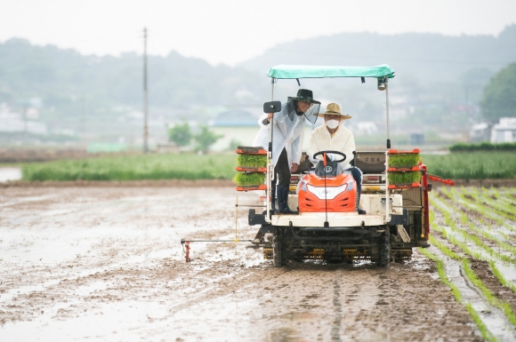 모내기 현장서 이앙기 직접 작동해 보는 장세용 시장