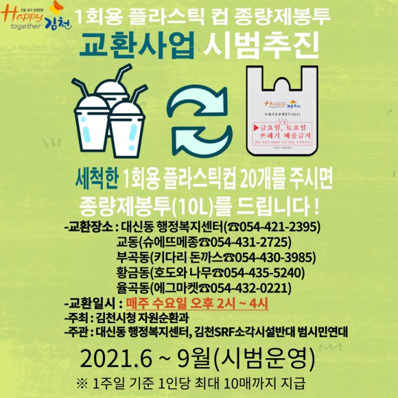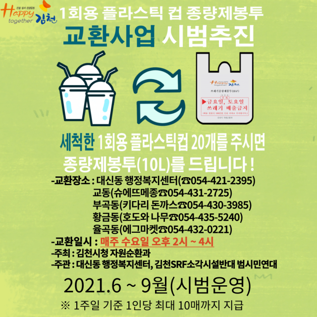 「1회용 플라스틱 컵 종량제 봉투 교환 사업」은 6월부터 김천시 전역에 버려져 있는 1회용 플라스틱 컵 20개를 10L 종량제봉투 1매로 교환해주는 사업이다.
