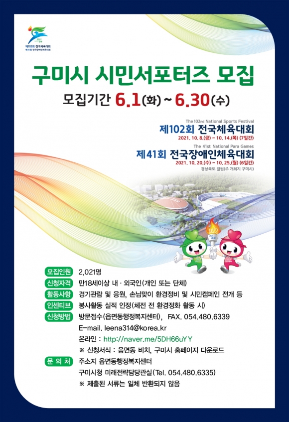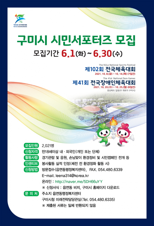 구미시가 오는 10월 개최되는 제102회 전국체육대회·제41회 전국장애인체육대회의 성공적 개최를 위해 이달 30일까지 시민서포터즈 2,021명을 모집한다.
