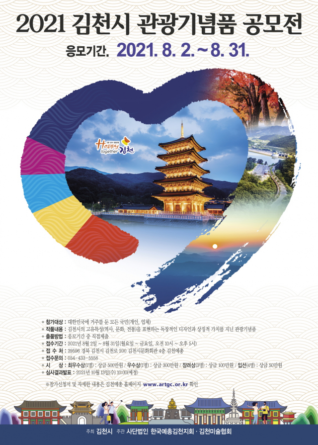 김천시(시장 김충섭)가 '김천'하면 떠오르는 관광기념품 발굴을 위해 6월부터 8월까지 석 달간 '2021년 김천시 관광기념품 공모전'을 개최한다.