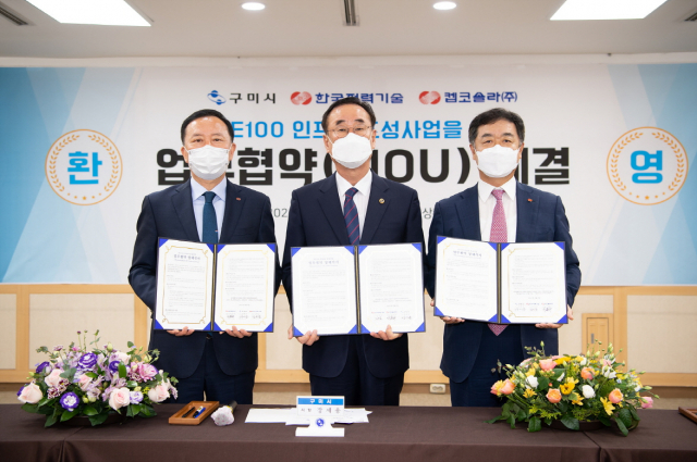 구미시는 지난 8일 구미시청 상황실에서 한전력기술(주), 켑코솔라(주)와 RE100(Renewable Energy 100, 재생에너지 전력 100% 충당) 인프라 조성사업을 위한 업무협약(MOU)을 체결했다.
