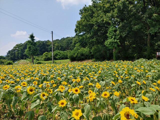 유휴지의 재활용으로 만들어낸 해바라기 꽃밭은 감문면 삼성리에서 성촌리로 이어지는 감문로 도로에서 감상할 수 있다.