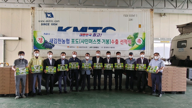 김천시(시장 김충섭)가 지난 1일 새김천농협에서 수출농가와 수출업체 등 10여명이 참석한 가운데 올해 수확한 포도를 처음으로 수출하는 수출 선적식을 가졌다.