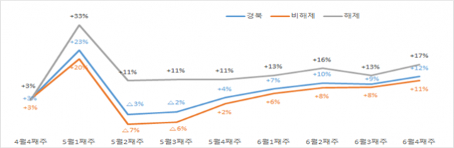 | ↑↑ < 집합금지 해제 이후 전년동기대비 소비 증감율 추이 > |