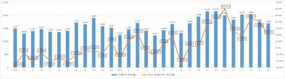 구미상공회의소(회장 윤재호)에 다르면 한국무역협회 자료를 토대로 2021년 상반기 구미지역 수출 동향을 분석한 결과 구미지역 상반기 수출액은 114억 4백만불로 지난해 85억 36백만불보다 33.6%증가했다.