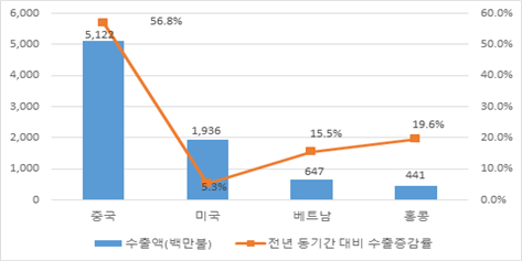 지역별 수출을 보면 상위 4개국의 상반기 수출액은 중국(44.9%)이 51억 22백만불로 전년 동기간 대비 56.8% 증가했고, 미국(17.0%)은 19억 36백만불로 5.3%, 베트남(5.7%)은 6억 47백만불 15.5%, 홍콩(3.9%)은 4억 42백만불 19.6% 각각 증가했다.