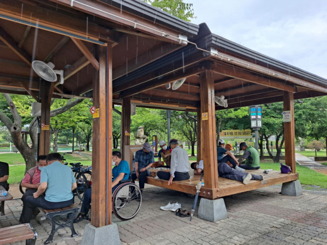김천시가 전염병과 기후변화라는 이중 재난 앞에서 다수의 노인들이 많이 이용하는 공원의 정자 및 쉼터에 선풍기를 설치했다.