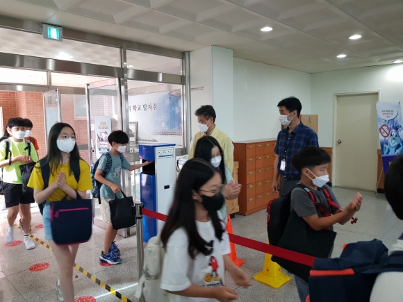 경상북도구미교육지원청(교육장 신동식)은 8월 26일 구미왕산초등학교를 방문해 2학기 첫 등교하는 학생들을 맞이하고, 발열체크 ‧ 급식 운영 등 학교 현장의 방역 사항을 점검했다.