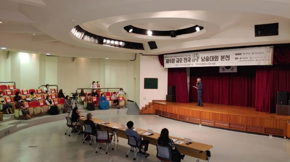 제6회 금오전국시낭송대회가 지난 25일구미시립중앙도서관 강당에서 개최됐다. 전국에서 시낭송 애호가와 청소년 등 350여명이 예선에 참가, 치열한 예심을 통과한 45명이 이날 본선 대회에서 각자 아름다운 낭송을 뽐내며 열띤 경연을 벌였다.
