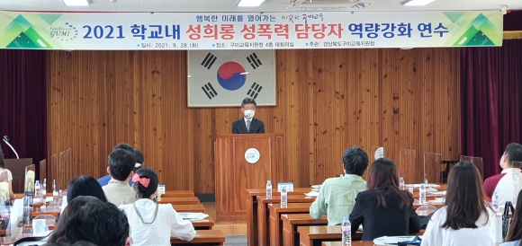 경상북도구미교육지원청(교육장 신동식)이 학교폭력없는교육 현장을 위해 관내 초‧중‧고등학교를 대상으로 하반기 학교폭력 책임교사 및 성희롱‧성폭력 사안처리 담당자 역량강화 연수회를 9월 23일, 28일에 실시했다.