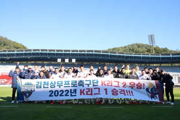 | ↑↑ 김천상무프로축구단이 부천FC와의 경기에서 조규성의 결승골로 1대 0으로 승리해 K리그2 우승을 확정지었다. (사진_김천상무 제공) |