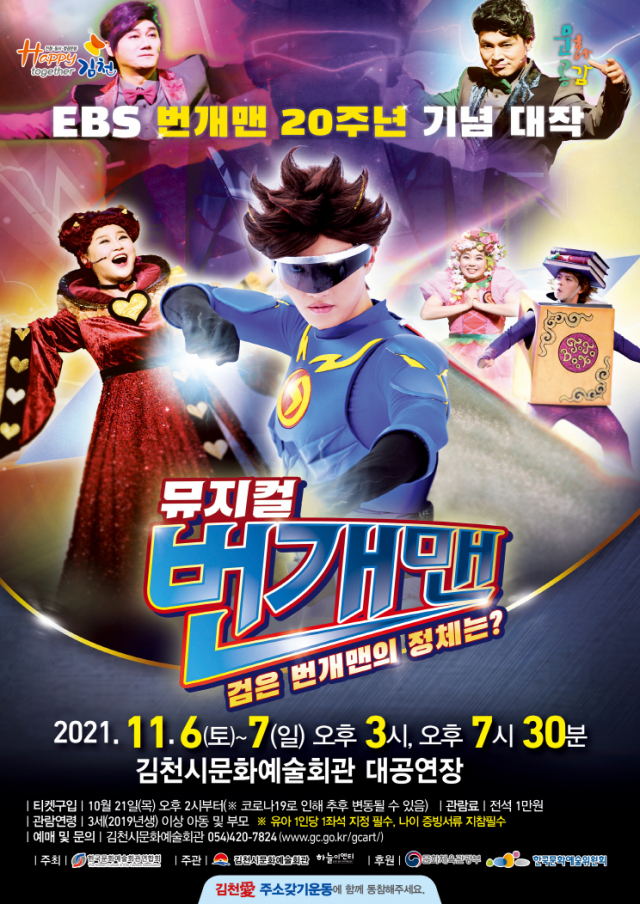 김천시 문화예술회관(관장 신동균)이 기획공연 ‘EBS 번개맨 뮤지컬 : 검은 번개맨의 정체는?’을 오는 11월 6일과 7일 오후 3시, 오후 7시 30분 총 2일 4회에 걸쳐 문화예술회관 대공연장에서 개최한다.