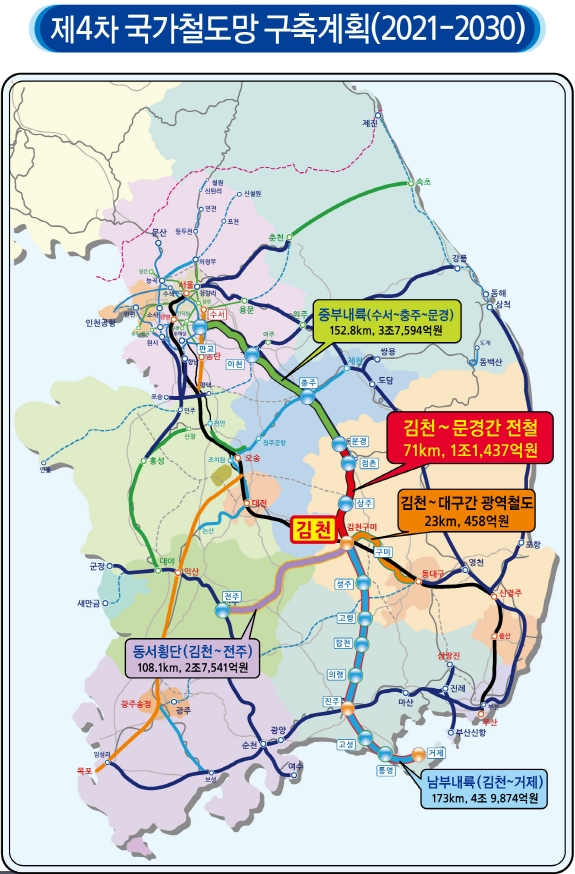 금번 반영된 사업으로는 신규사업으로 선정된 ▲달빛내륙철도(광주~대구) ▲전라선(익산~여주) 경부고속선(광명~평택) ▲ 서해선과 경부고속선 연결선 ▲ 삼척~강릉선과 함께 추가검토사업으로는 유일하게 김천~전주선이 포함되어 사실상 신규사업으로의 위상을 확보하는 한편 김천시의 십자축 철도망 구축 플랜에 탄력을 받게 됐다.