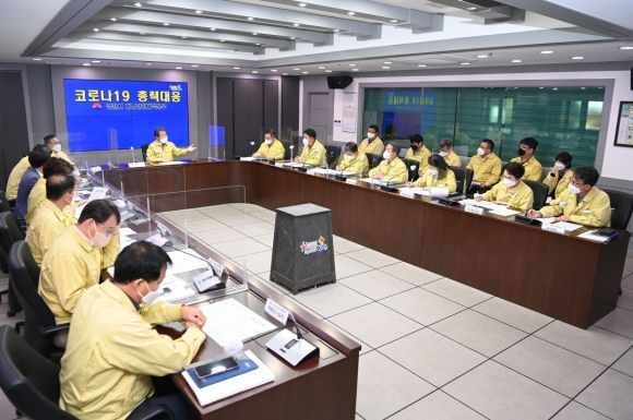 김천시(시장 김충섭)가 지난 28일 코로나19의 지역 확산 차단을 위하여 코로나19 방역 대책 긴급회의를 재난상황종합실에서 진행했다.