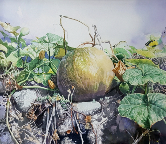 기증작 '햇살 받으며...'는 돌담 위의 호박넝쿨이 사실적으로 표현된 따뜻한 정서를 느낄 수 있는 작품이다. 기증된 작품은 구미문화예술회관 휴게홀의 상설 소장품전에 전시된다.