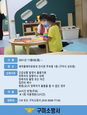 돌봄신청은 부모 또는 기타 양육권자가 119나 구미소방서(☎010-3039-7119)에 신청하면 긴급돌봄 서비스를 제공받을 수 있으며, 돌봄장소는 구미소방서 신청사 신축공사가 완료되기 전까지 상모동 새마을테마공원 내 전시관 부속동 1층에서 운영할 예정이다.