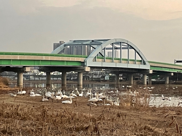 10일 샛강 전망대쪽인 33번국도 다리 아래의 샛강에는 큰고니 300여마리가 꽥꽥 울음 소리를 내며 강을 가득 메우고 있다. 부리를 물속으로 넣고 꼬리를 하늘로 치켜들고 먹이를 찾는 고니들, 고고한 자태로 수영하는 고니들, 물속에서 나와 물가에 서 있는 고니들, 모두 제각각의 모습으로 생동감이 넘친다.