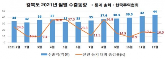 경상북도가 지난해 총수출이 2020년 371억 달러보다 19.3% 증가한 443억 달러를 달성, 뚜렷한 회복세를 보였다.