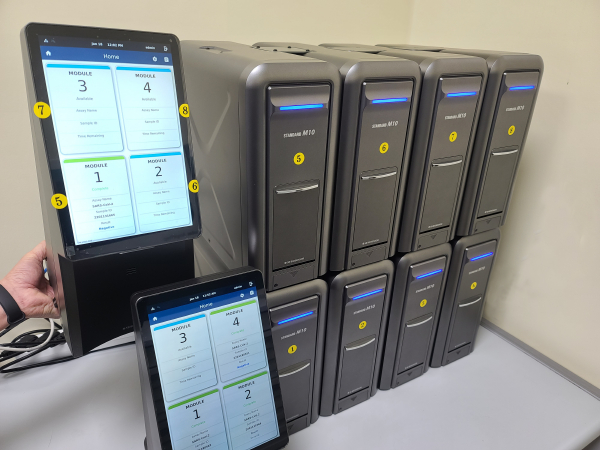 M10은 유전자(ORF1ab, E gene) 동시 검출 가능, 카트리지 내 단독검사가 진행되어 교차오염 위험 감소, 5000개의 결과 저장 가능, 사용량에 따른 모듈 확장성이 있어 기존 PCR 사용이 어려웠던 공간에도 세팅 가능한 장점이 있다.