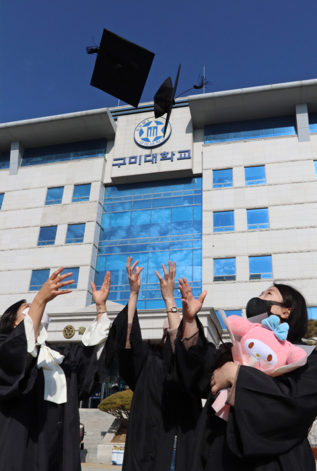 | ↑↑ 지난 27일 구미대학교 졸업식날 본관 앞 광장에서 광장에서 학사모를 날리고 있다. (구미대 제공) |