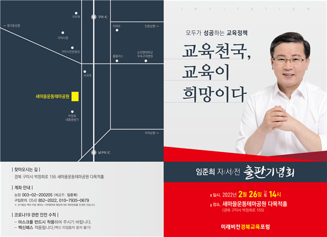 임준희 경북교육감 예비후보는 오는 26일(토) 오후 2시 구미 새마을운동테마공원 다목적홀에서 그의 자서전인 <교육천국, 교육이 희망이다>의 출판기념회를 가진다. 이번 출판기념회는 안동과 포항에 이은 세 번째이자 마지막 출판기념회다.
