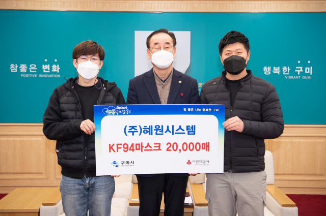 지역의 마스크 제조업체인 ㈜혜원시스템(대표 이영준)이 25일 코로나19 극복을 위한 KF94 마스크 2만매(300만원 상당)를 구미시에 기탁했다.