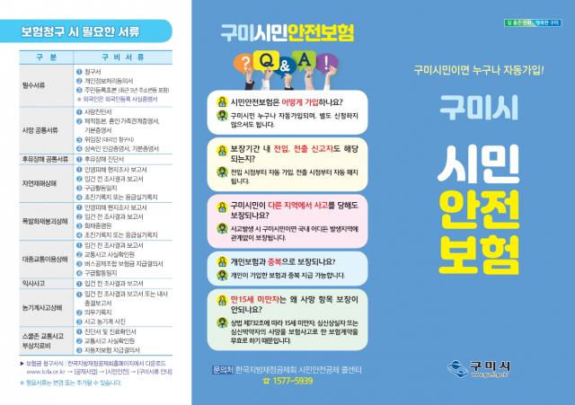 자세한 상담문의는 한국지방재정공제회 콜센터(1577-5939) 또는 구미시청 안전재난과(054-480-6733)를 통해 가능하며, 보험내용 및 청구서류는 공제회 홈페이지(www.lofa.or.kr) 또는 구미시 홈페이지(www.gumi.go.kr)에서 확인할 수 있다.