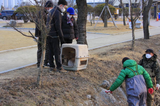지난달 20일 늦은 오후, 박희천 박사(조류학자, 생태환경연구소 소장)를 비롯해 대구야생동물구조센터 직원들은 그동안 생태환경연구소에서 구조해 보호해온 '샛오르미'를 지산 샛강에 방사했다. 홀로 남았을 때만 해도 유조였던 '샛오르미'는 회색빛에서 흰색빛으로 바뀌었을 만큼 성조로 변한 모습이다.