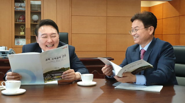 | ↑↑ 18일 이철우 경북도지사가 대통령인수위원회를 방문해 윤석열 당선인에게 경북공약을 건의하고 있다.(경북도 제공) |