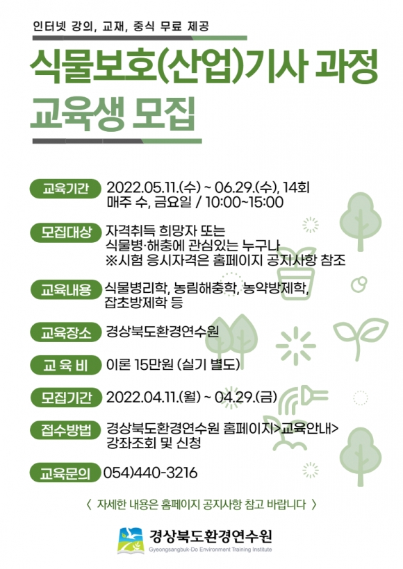 경상북도환경연수원(원장 심학보)이 식물 피해의 진단 및 방제를 전문적으로 할 수 있는 식물보호 전문가 양성을 위해 '식물보호(산업)기사 양성과정' 교육생을 이달 29일까지 모집한다.