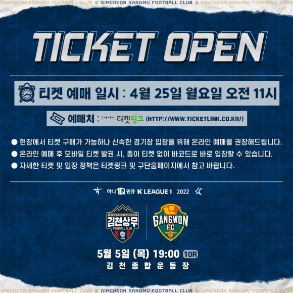 김천상무프로축구단(대표이사 배낙호)이 지난 25일 오전 11시, 온라인 예매 사이트 티켓링크를 통해 5월 5일 오후 7시, 김천종합운동장에서 열리는 ‘하나원큐 K리그1 2022’ 10R 강원FC 홈경기 티켓 예매를 시작했다.