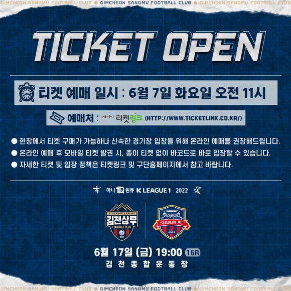 김천상무프로축구단(대표이사 배낙호)이 7일 오전 11시, 온라인 예매 사이트 티켓링크를 통해 17일 오후 7시, 김천종합운동장에서 열리는 ‘하나원큐 K리그1 2022’ 16R 수원FC와 홈경기 티켓 예매를 시작한다.