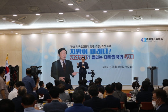 구미상공회의소(회장 윤재호)가 8일 2층 대강당에서 원희룡 국토교통부 장관 초청 '지방이 미래다! 기업투자가 몰리는 대한민국의 구미'를 주제로 조찬 특강을 가졌다.