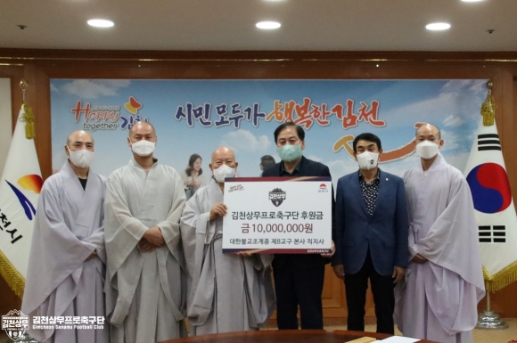 직지사(주지 법보스님)가 김천상무에 후원금 1천만원을 전달했다.