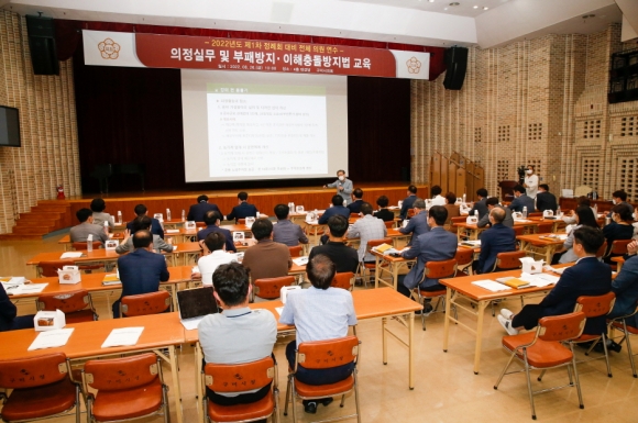 오후에는 (사)한국청렴운동본부 이지문 이사장을 초청해 지방의회의원 행동강령 및 청탁금지법과 관련된 실제 다양한 사례를 중심으로 교육을 진행했다. 특히 올해 5월 19일부터 시행된 공직자의 이해충돌방지법에 관해 심도 높은 강의와 문답을 나누는 시간을 가졌다.