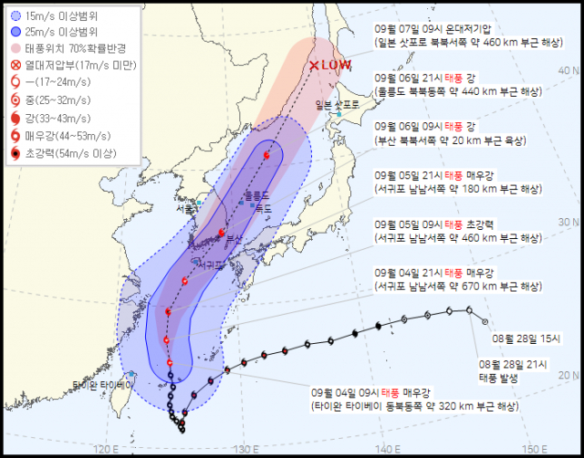 기상청은 이번 태풍 ‘힌남노’가 중심기압 915hpa(헥토파스칼), 최대초속 55m(시속198km)의 ‘초강력’ 태풍으로 지난 2003년 한반도를 휩쓸고 간 태풍 ‘매미’에 견줄 정도로 강력한 태풍이라고 발표했다.