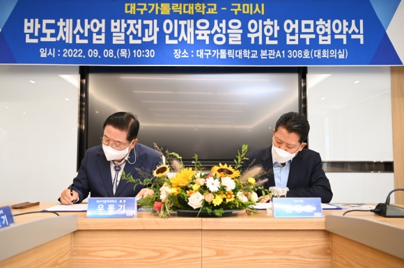 구미시가 반도체 산업 발전 및 인재육성을 위해 8일 대구카톨릭대학교(총장 우동기)와 업무협약을 체결했다.