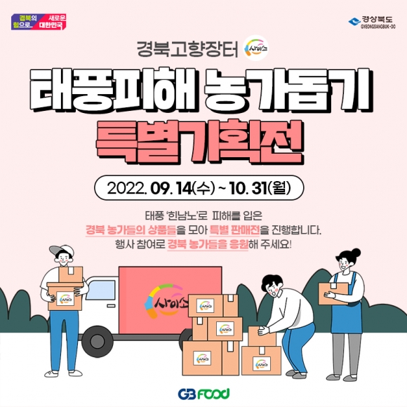 경상북도가 14일부터 경북 고향장터 사이소를 통해 태풍 힌남노 피해 농가 돕기 특별기획전을 연다고 밝혔다.